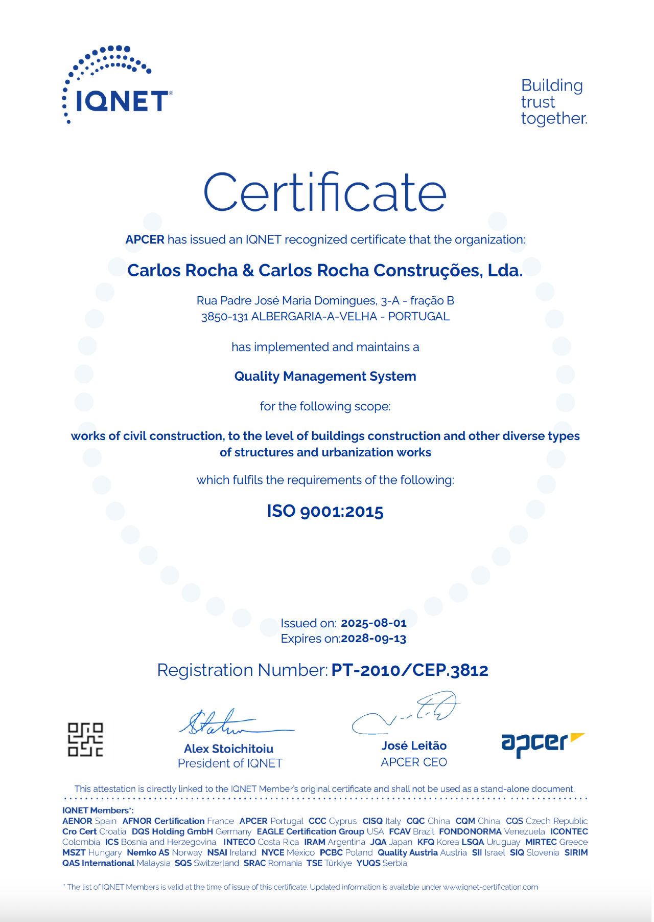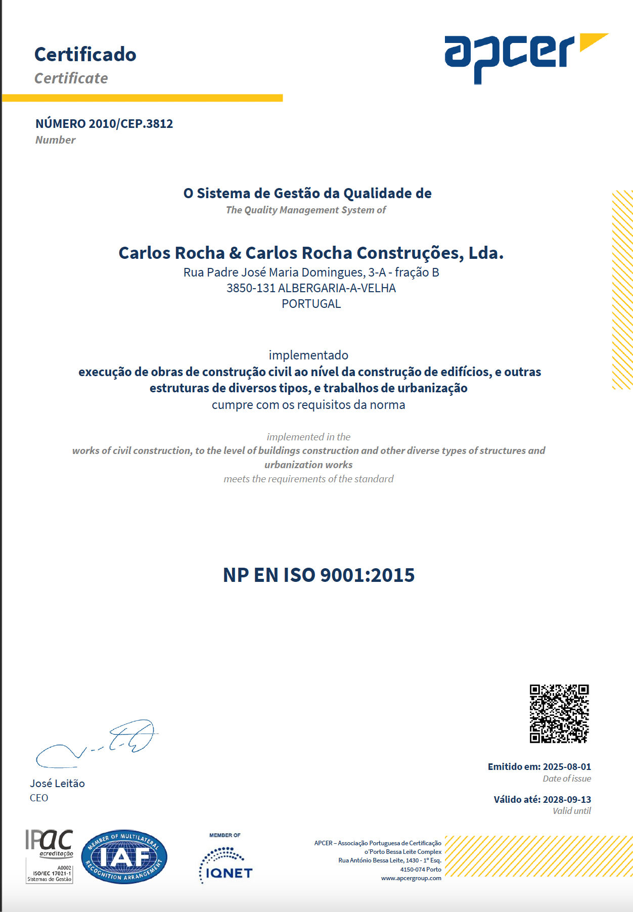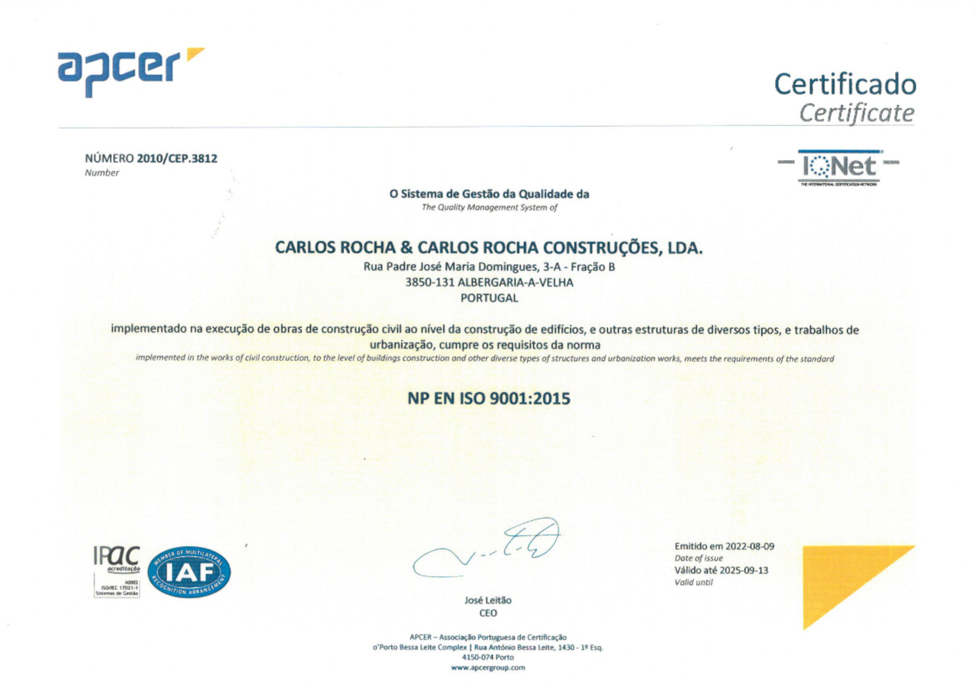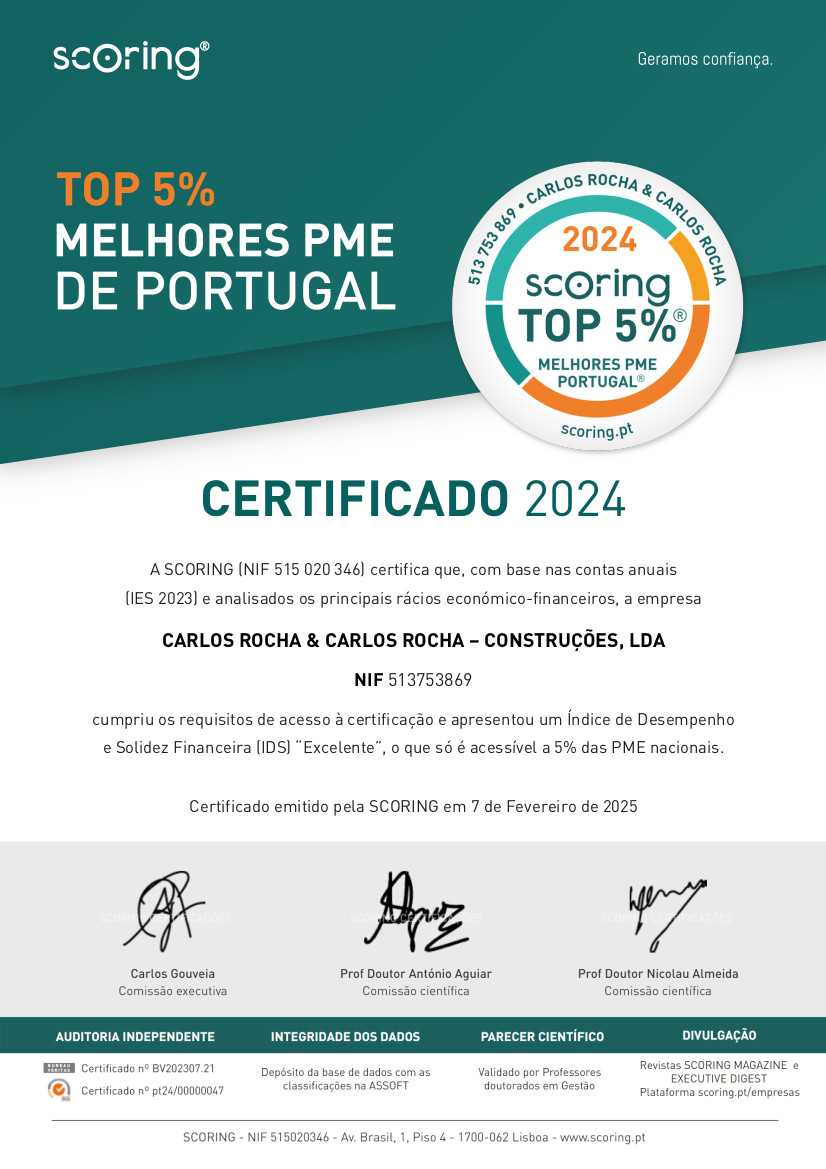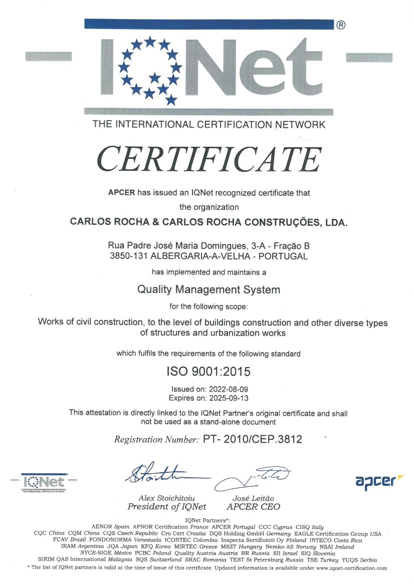 Neste sentido temos vindo a desenvolver várias iniciativas para melhorar constantemente a nossa postura neste mercado, apostando em certificações de qualidade que nos permite aprimorar todo o nosso processo de Construção e Serviços prestados.
